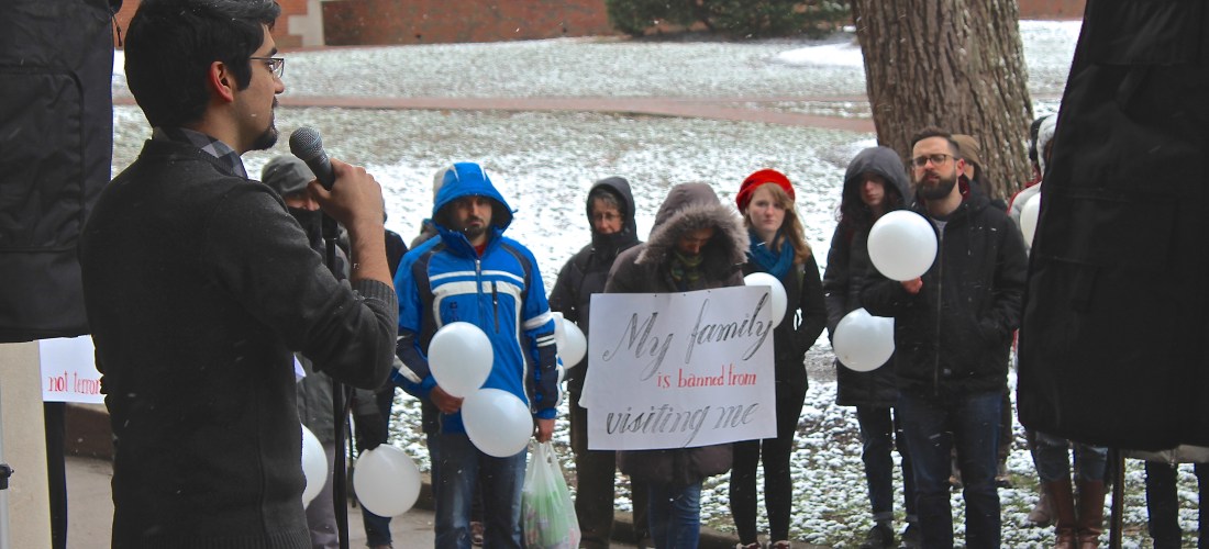 Members and supporters of Ohio University’s Iranian Students Society rallied Thursday afternoon in protest of President Donald Trump’s travel ban.